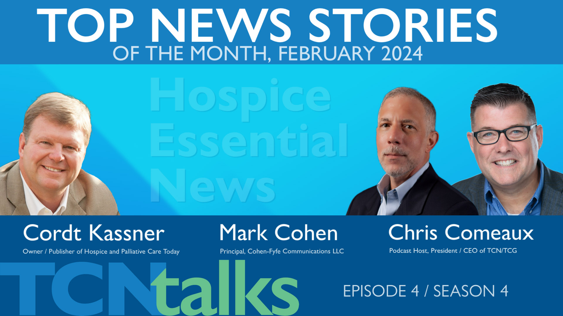 In this episode of TCNtalks, Chris Comeaux, Mark Cohen, and Cordt Kassner discuss the top news stories in Hospice and Palliative Care for December 2024. This episode marks the end of Mark’s two-year run of partnering with Chris to review the month’s top stories, with Cordt taking on that role going forward, along with his colleague at Hospice & Palliative Care Today, Joy Berger.